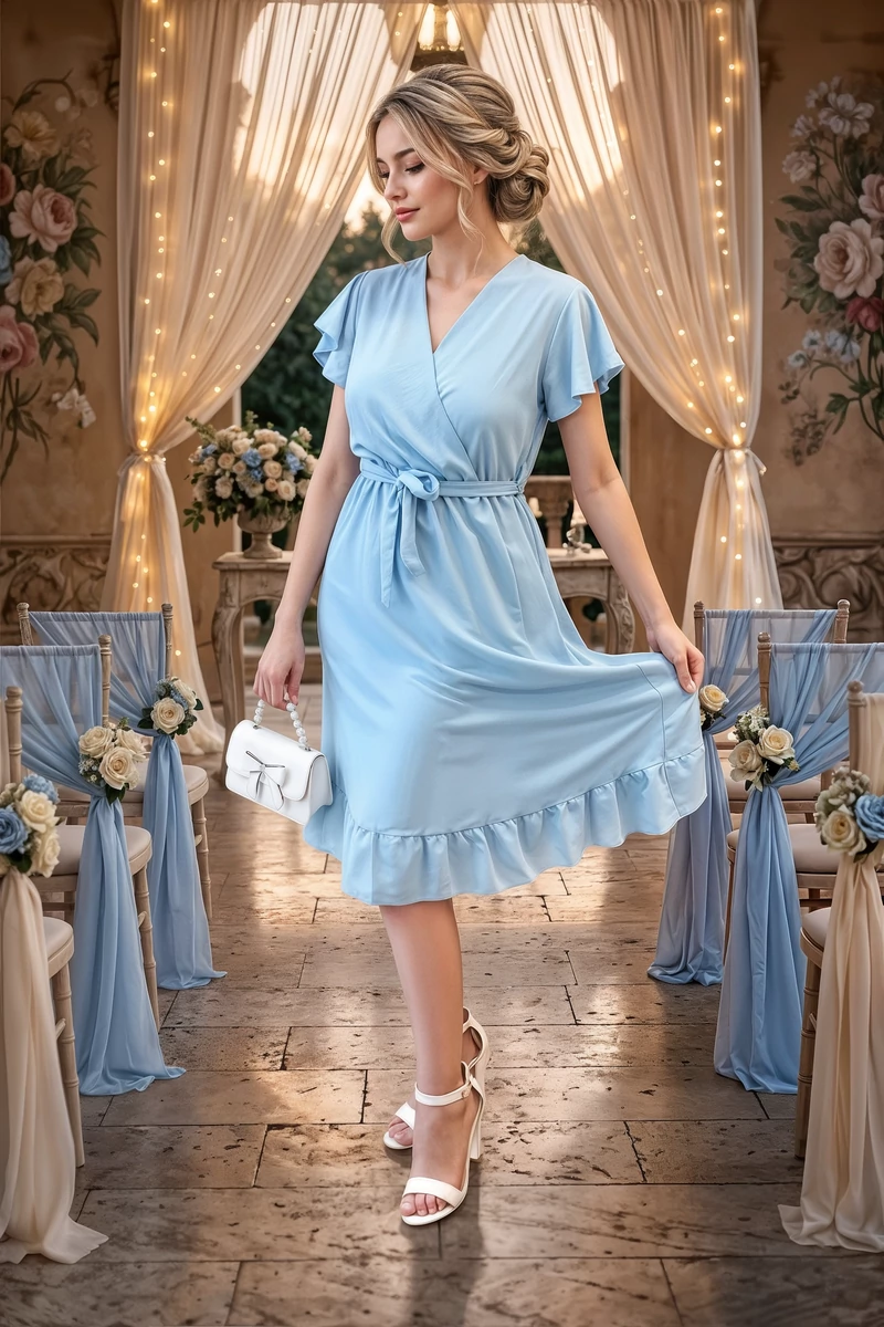 A ruha légies esése, romantikus fodrai és halvány, égszínkék árnyalata igazán nőies, lágy megjelenést biztosít. Kiváló választás esküvőre, nyári ünnepségre vagy elegáns vacsorára. A ruha mozgás közben életre kel, minden lépésnél bájt és kecsességet sugároz.